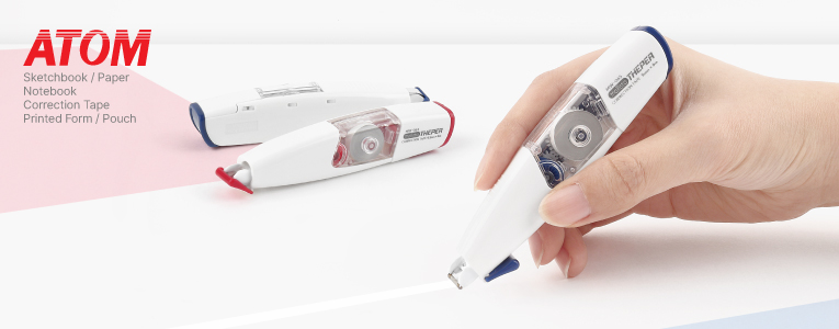 펜 타입 수정테이프. 부드러운 미니 롤러 헤드. 얇지만 비치지않는 원단, 편리한 리필교환방식.